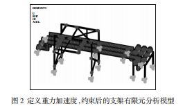 3載荷,捆綁的模仿定義重力加速度9800mm/s2,在支架立柱底端及其他相應(yīng)方位施加捆綁。如圖2所示,為定義重力加速度,捆綁后的ANSYS仿真圖。