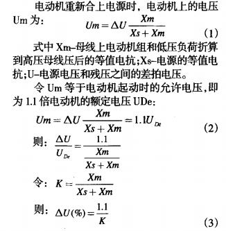 圖2所示為電動機從頭接通電源時的等值電路圖和相角圖,從圖中可以看出,不同的0角(電源電壓和電動機殘壓二者之間的夾角),對應不同的△U值,如0=180o時,AU值最大,假設此時從頭合上電源,對電動機的沖擊最嚴峻。根據母線槽上成組電動機的殘壓特性和電動機耐受電流的才干,在極坐標上可繪出其殘壓曲線。